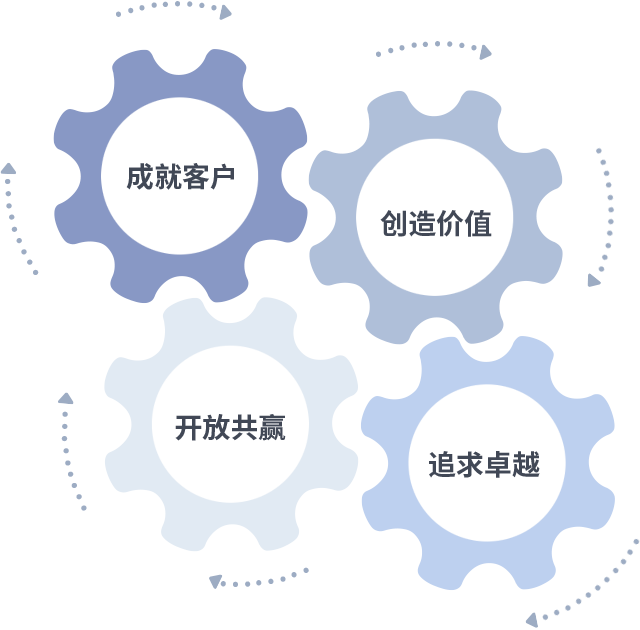 成就客户是一切决策的出发点,,,,创造价值是衡量所有工作的标准,,,追求卓越是我们做事做人的态度,,,开放共赢是我们的格局也是最终的结果。。价值观的齿轮环环相扣,,,,推动着组织里的每个人不断向前。。